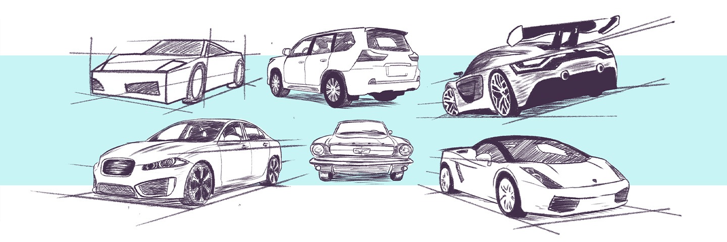 Odwzorowanie auta w najdrobniejszych detalach może być skomplikowane, ale już naszkicowanie prostego kształtu samochodu niekoniecznie. Kluczem do sukcesu jest zrozumienie perspektywy. Aby dobrze ją uchwycić, narysuj siatkę pomocniczą, prowadząc linie z dwóch znikających punktów w górnych rogach kartki do trzeciego znikającego punktu znajdującego się u dołu. Dzięki temu samochód będzie miał odpowiednie proporcje. Zacznij od narysowania kół, mając na uwadze, że odległość między nimi powinna odpowiadać mniej więcej trzem średnicom jednego koła. Pamiętaj też, że koła mają kształt elipsy widzianej w perspektywie, nie rysuj ich więc płasko. Naszkicuj dolne kontury samochodu, a następnie resztę nadwozia. Do narysowania szczegółów takich jak okna, klamki i maskownica użyj cieniowania i miększych ołówków.