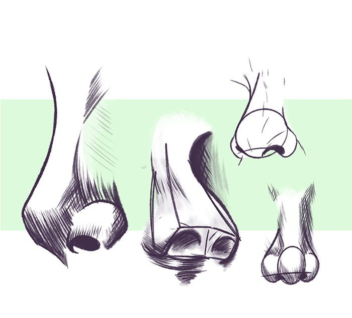 Aby uzyskać podstawowy, „bazowy” kształt nosa, narysuj zwykły trójkąt z diamentem u dołu. Następnie naszkicuj nozdrza i dodaj cieniowanie u góry i u dołu. Nos będzie wyglądał bardziej realistycznie, jeśli wycieniujesz go tak, by był ciemniejszy od dołu.