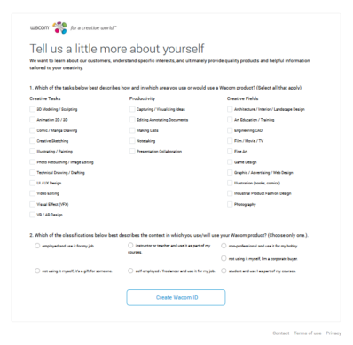 Zostajesz przekierowany na stronę z rejestracją – aby pobrać oprogramowanie musisz zarejestrować się na stronie lub stworzyć swój „Wacom ID”.