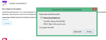 Pojawi się komunikat o pobieraniu pliku instalacyjnego sterownika. Wybierz [Zapisz plik], a następnie uruchom plik instalacyjny (oznaczony WacomTablet_xxx.exe). Po instalacji oprogramowania należy uruchomić ponownie komputer. - Ściągnij oprogramowanie. Wejdź na powyższą stronę i przewiń ją w dół, naciśnij [Download software]. Możesz zainstalować oprogramowanie w dowolnym momencie, wystarczy wejść do sterownika Wacom Desktop Center.