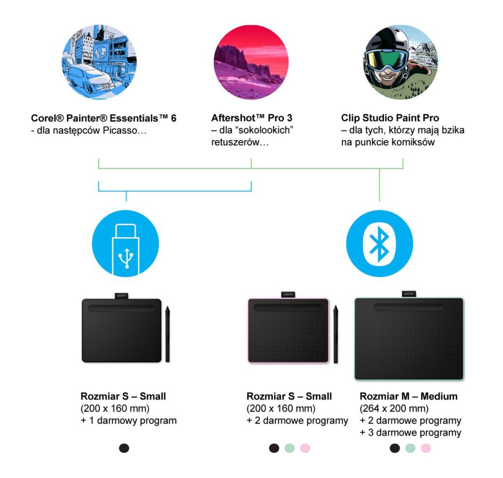Uwaga! W zależności od posiadanego modelu możesz pobrać 1 (Intuos S), 2 (Intuos S Bluetooth) lub 3 (Intuos M Bluetooth) aplikacje.