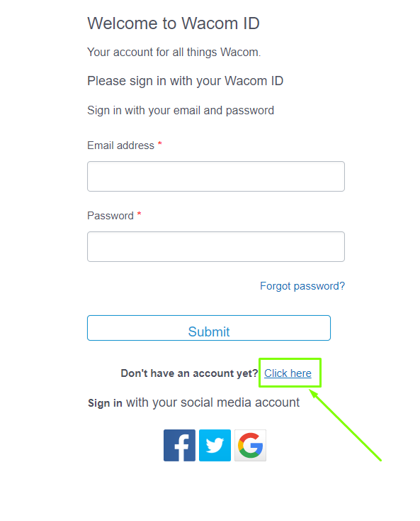 Aby stworzyć konto Wacom ID, wejdź na stronę: https://www.wacom.com/login.html i kliknij na link Click here