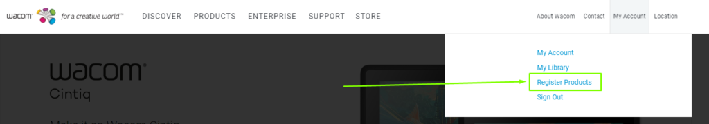 Zostaniesz poproszony o potwierdzenie rejestracji. Na podany adres mailowy przyjdzie wiadomość o tytule: Wacom awaits… please verify. Aktywuj link Activate link. Zostaniesz przekierowany na stronę www.wacom.com. W górnej belce wybierz My Account, a następie Register Products.